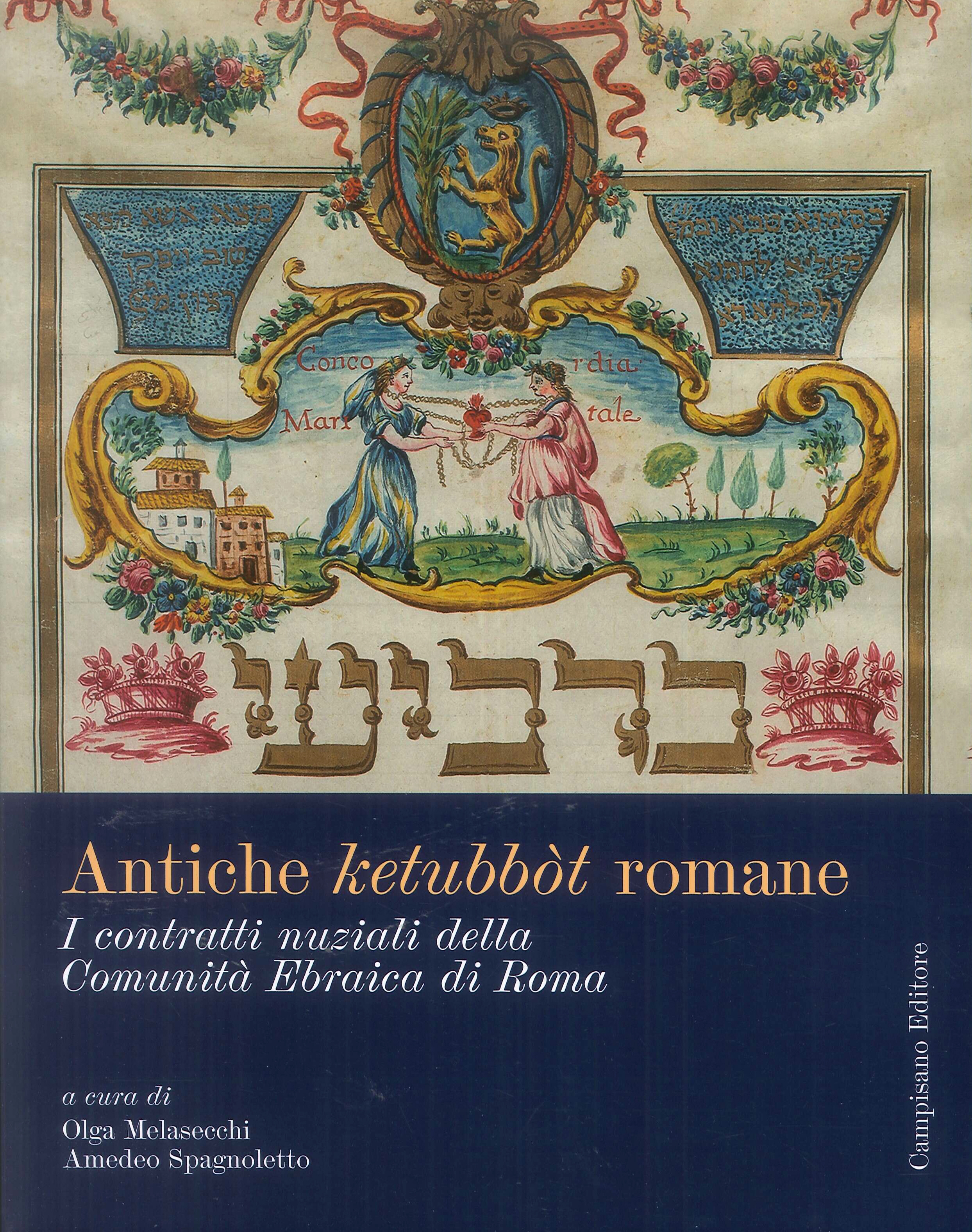 Il termine ketubbà (pl. ketubbòt) deriva dalla radice ebraica katav che significa scrivere, redigere. È un documento di natura giuridica che nel matrimonio ebraico certifica le obbligazioni assunte dal marito a favore della moglie e che concorre a svolgere anche funzioni probatorie del vincolo. La sua origine è molto antica: seppure non sia citata esplicitamente, secondo alcuni maestri e studiosi è possibile rinvenirne le tracce nei libri biblici. Presso il Museo Ebraico di Roma e l’Archivio della Comunità Ebraica di Roma sono conservate ottantasei splendide ketubbòt di produzione romana in pregiata pergamena di pecora, scritte a mano e decorate all’acquarello, databili tra la fine del sec. XVII e l’inizio del sec. XX. L’arte di decorare i contratti matrimoniali ebraici ha trovato infatti a Roma uno dei luoghi di maggiore sviluppo in Italia. Il valore storico di questi documenti era molto importante, attraverso di essi le famiglie non solo manifestavano il proprio status sociale, ma celebravano anche momenti esaltanti e felici di libertà: molte sono le ketubbòt decorate con i colori della bandiera francese risalenti dunque al favorevole periodo della dominazione napoleonica a Roma, e molte sono quelle con i colori della bandiera italiana, databili al periodo dell’Emancipazione, quando con l’Unità d’Italia, e soprattutto con la fine del potere temporale dei Papi e l’abolizione definitiva del ghetto, gli ebrei romani venivano finalmente equiparati agli altri loro concittadini. Il ricco apparato iconografico, le approfondite ricerche d’archivio condotte dai vari autori e la ricostruzione di complessi intrecci famigliari restituiscono uno spaccato di una società viva e culturalmente attiva, ancora poco nota anche negli ambienti ebraici nazionali e internazionali e al contempo costituiscono un valido aiuto per molti ebrei della Capitale a riappropriarsi delle proprie radici.