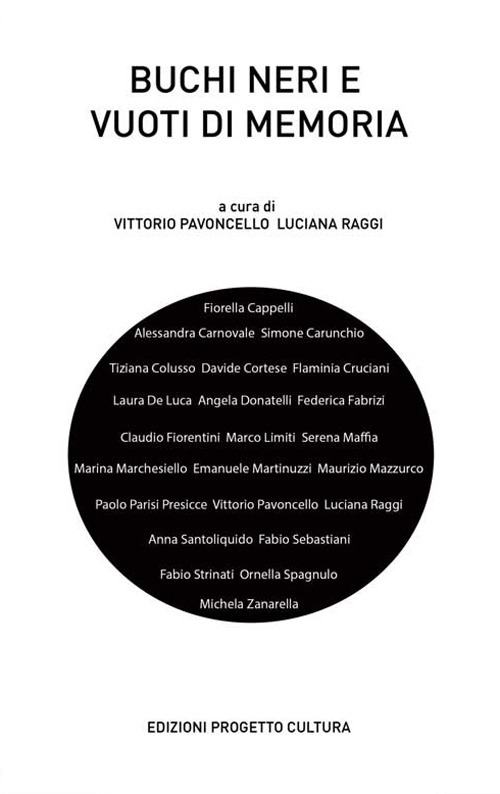 ""Buchi neri e vuoti di memoria" ha due copertine. È un oggetto un po' speciale perché per svelarsi appieno va manipolato e rigirato, aperto da entrambe le parti. L’altra faccia del libro è arricchita dalle opere visive di due artisti poeti, Serena Maffia e Vittorio Pavoncello, che seppure con tecniche e prospettive diverse, si integrano e ci coinvolgono con la loro forza espressiva". (Luciana Raggi). "Potremmo dire che Buchi neri e vuoti di memoria è un progetto ad una velocità elevatissima e proprio per questa sua caratteristica trascina con sé ciò che incontra. Nato da alcuni miei disegni a matita, attraverso l’incontro con Serena Maffia il progetto è diventato una mostra personale a due, facendo della situazione limite psicofisica dei buchi neri e dei vuoti di memoria una storia di attrazione del femminile e del maschile". (Vittorio Pavoncello)| Editore | Progetto Cultura |