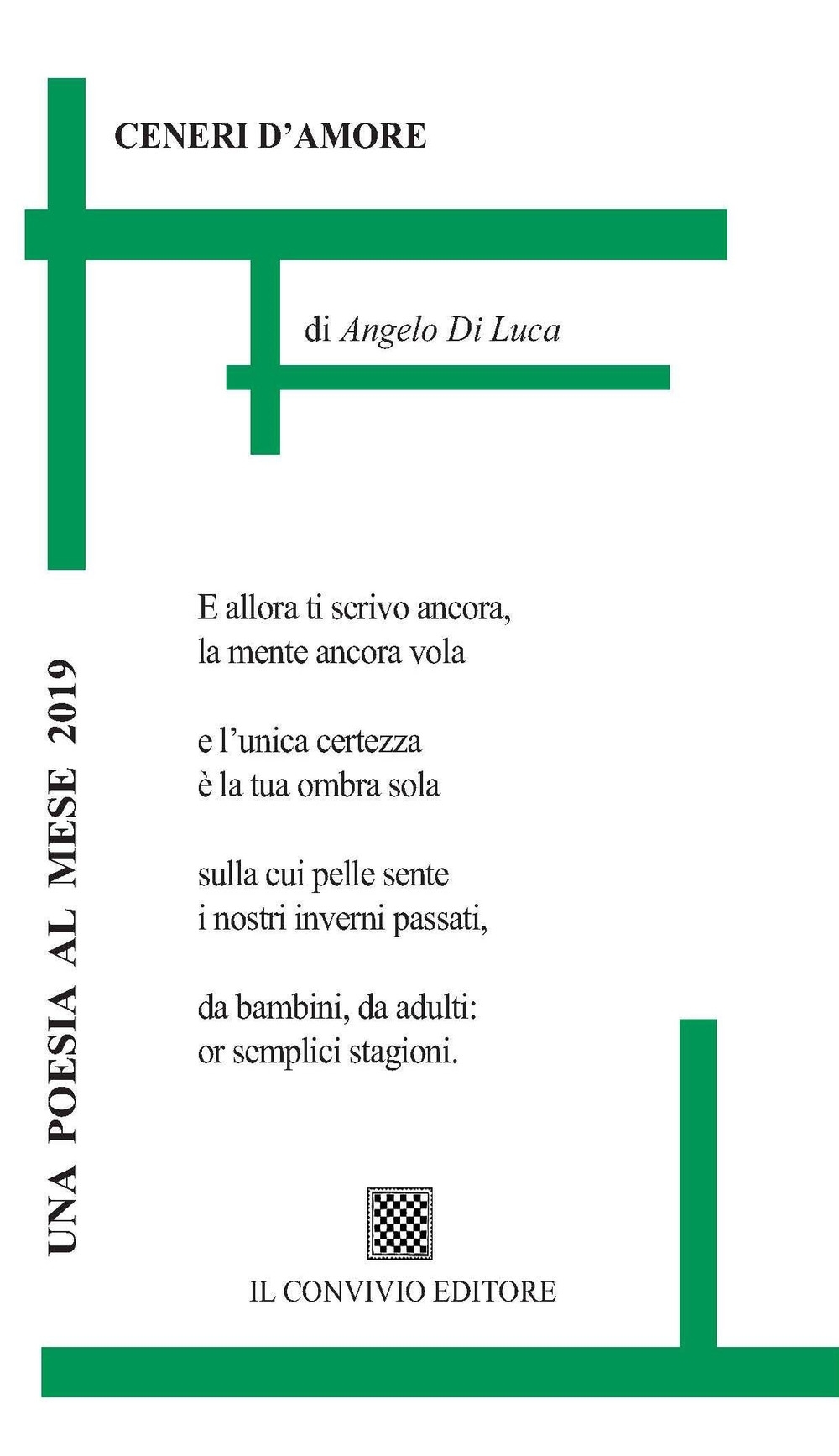 "E allora ti scrivo ancora, / la mente ancora vola / e l'unica certezza / è la tua ombra sola / sulla cui pelle sente / i nostri inverni passati, / da bambini, da adulti: / or semplici stagioni."| Autore | Angelo Di Luca |