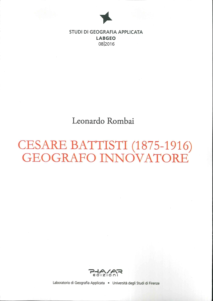 Il libro ricostruisce la biografia del geografo e politico socialista trentino Cesare Battisti (1875-1916), che tra l'agosto 1914 e il 12 luglio 1916 dedicò la sua vita di irredentista prima e di combattente poi, fino al martirio, alla liberazione del suo Trentino dal giogo austriaco e al suo passaggio nel Regno d'Italia. Di Battisti, l'opera mette in luce la formazione come geografo nell'Istituto di Studi Superiori di Firenze e, soprattutto, l'attività di appassionato e originale studioso del territorio trentino svolta tra 1897 e 1916, con produzione di tre monografie geografiche e di decine di articoli che, nell'insieme, si qualificano come assai innovativi nella ricostruzione e rappresentazione dei caratteri fisico-ambientali, paesistici, demografici, economici e socio-culturali della regione, anche per l'efficace corredo di un ampio corpo di cartografie tematiche.| Autore | Leonardo Rombai |
