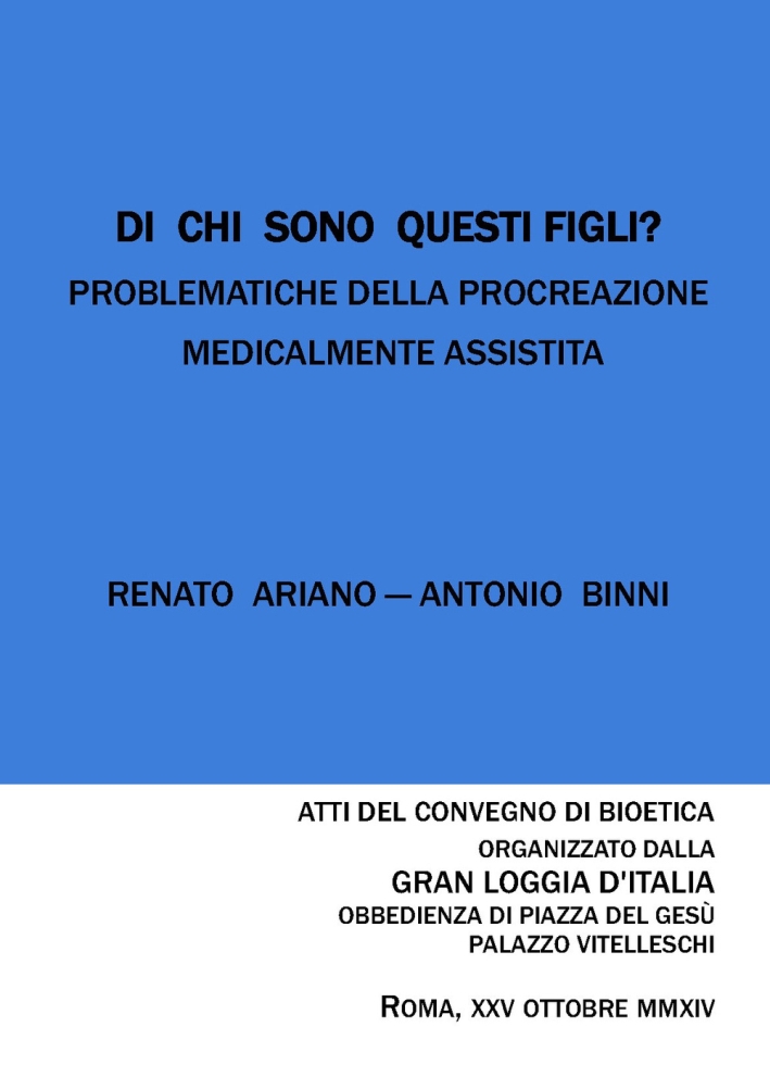 Il libro prende vita dagli "Atti del Convegno di Bioetica" organizzato a Roma dalla Gran Loggia d'Italia, Obbedienza di Piazza del Gesù nell'ottobre 2015. Elenco degli interventi: Prefazione - Antonio Binni Introduzione al convegno Renato Ariano La procreazione assistita nel dibattito bioetico - Luisella Battaglia La procreazione medicalmente assistita nel panorama legislativo e giurisprudenziale italiano - Ivan Iurlo Procreazione medicalmente assistita. Stato dell'arte - Giovanni Colpi Presente e futuro della genetica - Edoardo Boncinelli Esperienze di procreazione assistita in Roma - Francesco Timpano Fecondazione assistita: il punto di vista del ginecologo cattolico - Giovanni Plotti Di chi sono questi figli? Problematiche della procreazione medicalmente assistita e diritti dei genitori biologici -Filomena Gallo La posizione della chiesa valdese sulla procreazione medicalmente assistita - Silvestro Duprè Coppie omosessuali e diritto alla genitorialità - Massimo Frana Conclusioni del convegno - Renato Ariano.| Editore | Biblioteca delle Soluzioni |