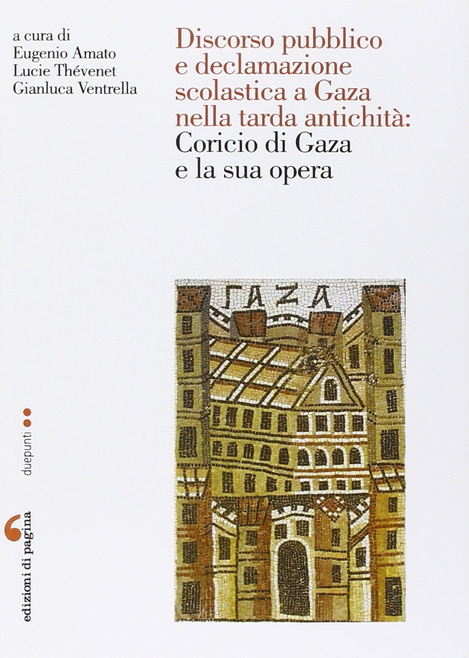 Città di frontiera e crocevia di popoli e culture differenti, nei secoli V-VI della nostra èra, la città di Gaza ospitò un'intensa e raffinata vita intellettuale, aperta al dialogo fra tradizioni apparentemente inconciliabili. Favoriti forse dalla geografia del luogo e dalla particolare congiuntura storica segnata dal passaggio, ancorché non sempre pacifico, tra civiltà classica e medioevo bizantino, gli intellettuali gazei seppero trovare una sintesi straordinaria tra antico e moderno che li consacrò al ruolo di mediatori culturali, capaci di ripensare e reinterpretare la tradizione ellenica in uno stimolante rapporto di interazione e scambio con il territorio e l'attualità. Non è forse un caso se Gaza, ormai all'apice della propria civiltà letteraria, potesse arrivare a contendere alla stessa Atene il prestigioso primato di capitale culturale dell'Impero d'Oriente. Il presente volume, dedicato a uno dei suoi più illustri letterati, il retore Coricio di Gaza, raccoglie gli Atti della giornata di studio che si è svolta presso la Cité des Congrès di Nantes, il 6 giugno 2014, con il sostegno dell'"Institut Universitaire de France", della Région des Pays de la Loire e del Centro di ricerca "L'Antique, le Moderne" dell'Università di Nantes. Esso s'inserisce nell'ambito di un più vasto progetto di edizione, traduzione e commento di tutto Coricio, diretto da E. Amato.