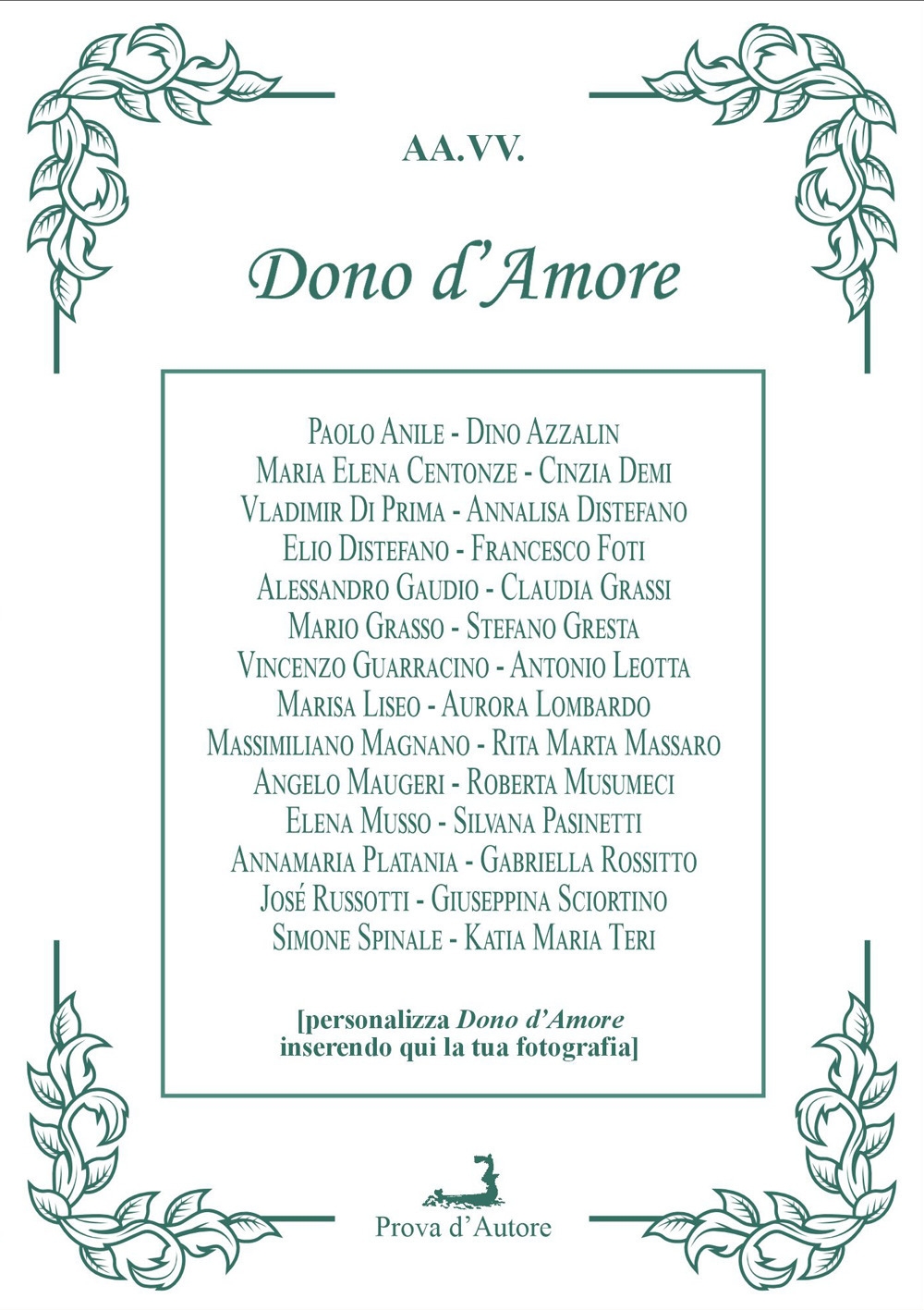 «"Dono d'Amore" è un'antologia di poesie che cantano l'Amore in tutte le sue mille declinazioni che segnano, tra l'estasi e il tormento, il senso profondo della vita e dell'esistere. Questa raccolta poetica è composta da 28 autori, che ne colgono l'essenza e le sfumature del corpo, della mente e dell'anima. La fonte, cui la curatrice, nonché editrice di Prova d'Autore e della rassegna Lunarionuovo , ha attinto queste composizioni poetiche, proviene dalle varie pubblicazioni della Casa editrice e della Rassegna suddetta, nonché da raccolte antologiche di diverso editore; molte liriche sono anche inedite. Quasi tutti gli Autori, più o meno giovani, le cui composizioni sono incluse in questa mini-antologia, fanno parte del virtuoso bagaglio di Prova d'Autore, il cui direttore editoriale è stato Mario Grasso, con pubblicazioni più o meno recenti e frutto delle iniziative che ha promosso nel corso dei diversi decenni e che la Casa editrice continua a promuovere. La realizzazione grafica di questo progetto consiste in accorgimenti tecnico-grafici, sia all'interno delle pagine, che contribuiscono ad esaltare l'edizione di questo Dono d'Amore, nonché della sua copertina adatta a trasformarsi in portafotografie, mentre la pagina interna, successiva al frontespizio, è bianca per accogliere la dedica personalizzata di quanti vorranno destinare questo libro-gloxinia a petit-cadeau per la persona amata. O, per occasioni diverse, come è successo per l'edizione del 2007 di Dedica d'Amore , uscita il 14 febbraio dello stesso anno e che in seguito è diventata bomboniera di nozze o di anniversari. "Dono d'Amore" ci invita a riflettere sul potere trasformativo dell'Amore, sia nella sua forma tragica che in quella sublime; questo tema universale , esplorato da Ovidio, Dante, Petrarca e Goethe, ha attraversato i secoli e lasciato opere che hanno segnato la storia della cultura e immortalato, attraverso la magia delle parole, momenti della nostra vita. Solo attraverso la forza dell'Amore, materia e spirito trovano la completezza per ricongiungersi alla Fonte dover risiede la risposta alle mille domande che affollano la mente umana, e che solo i poeti hanno la capacità e il coraggio di esprimere. Questa antologia è dedicata agli amanti e a tutti coloro che vogliono spingersi oltre il suolo della concretezza per soffermarsi e ascoltare quella voce sottile dell'Anima che si unisce a tutti» (dall'Introduzione di Daniela Marra)| Editore | Prova d'Autore |