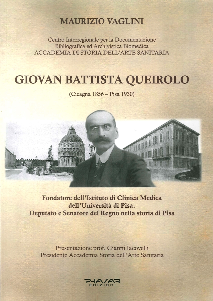 Giovan Battista Queirolo è tra i più importanti clinici medici di fine ’800-inizio ’900, riconosciuto in Italia e all’estero, al quale sono attribuite anche doti umane non comuni, tanto da essere indicato come “il medico dei poveri”. Allievo di Maragliano, a Pisa si distingue per disponibilità, oratoria ed intelligenza, coinvolge grandi personalità, per finire nella vita politica della città. Il suo motto sarà sempre “scienza e carità”. Viene eletto nelle file del partito monarchico liberale prima come deputato e poi come senatore del Regno, per gli interessi della città. Realizza l’Istituto di Clinica Medica e si impegna in lotte sindacali a favore di diverse classi sociali. A contatto di grandi poeti come Borchardt e Pascoli, la sua vita è caratterizzata dall’amicizia con il Re Vittorio Emanuele e con la Regina Elena. Durante la I guerra mondiale è a favore dell’interventismo. Con l’avvento del fascismo fa parte del sistema. Viene nominato Direttore di vari stabilimenti Termali (Bagni di Pisa, Bagni di Lucca, Terme di Montecatini, Acque della Salute di Livorno, Uliveto Terme e Acqua acidula di Agnano). Viene sepolto nella Chiesa Monumentale di San Francesco di Pisa.| Autore | Maurizio Vaglini |