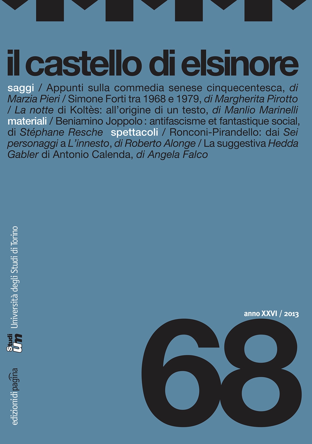 "Il castello di Elsinore" è una rivista semestrale di teatro profondamente radicata nell'Università italiana. Nata nel 1988 e curata dal DAMS (Dipartimento di Discipline Artistiche, Musicali e dello Spettacolo) dell'Università di Torino, la rivista raccoglie nel suo comitato direttivo quasi la metà degli ordinari di Storia del teatro in Italia e illustri studiosi di università straniere. Dal 2008 è pubblicata dalle Edizioni di Pagina. La rivista è articolata in tre sezioni: la prima, intitolata Saggi, comprende rigorosi studi critici su personaggi e opere della storia del teatro e dello spettacolo; la seconda, Materiali, raccoglie e cura documenti, lettere e riflessioni di poetica; la terza, Libri (o Polemiche), recensisce e analizza gli avvenimenti più significativi della stagione teatrale italiana e straniera. I temi di cui la rivista si occupa sono svariati e attraversano l'intera storia del teatro europeo, dal teatro greco alla Commedia dell'Arte, dal teatro rinascimentale italiano al teatro nordico di Ibsen e Strindberg, dal simbolismo europeo a Pirandello.| Editore | Edizioni di Pagina |