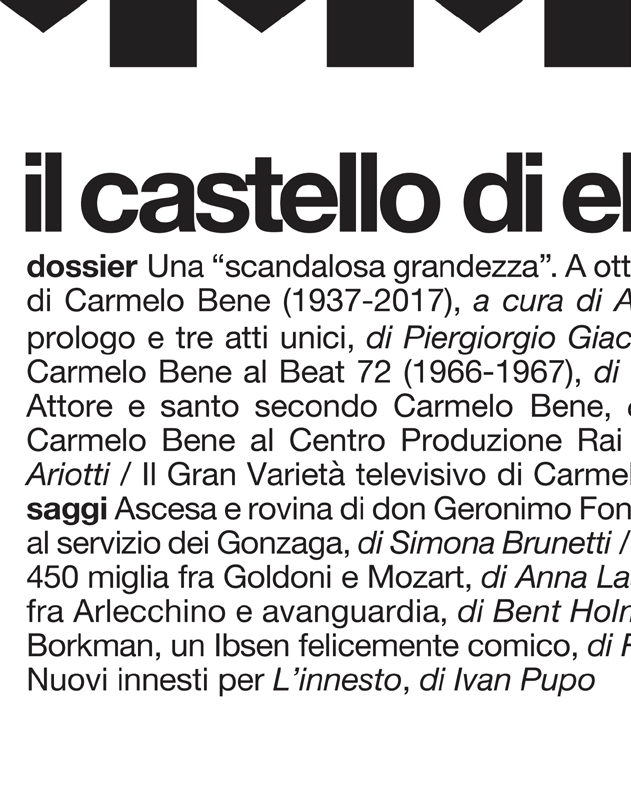 «Il castello di Elsinore» è una rivista semestrale di teatro profondamente radicata nell'Università italiana. Nata nel 1988, la rivista raccoglie nel suo comitato scientifico quasi la metà degli ordinari di Storia del teatro in Italia e illustri studiosi di università straniere. La rivista è articolata in tre sezioni (talvolta quattro): la prima, intitolata Saggi, comprende rigorosi studi critici su personaggi e opere della storia del teatro e dello spettacolo; la seconda, Materiali, raccoglie e cura documenti, lettere e riflessioni di poetica; la terza, Spettacoli (e/o Libri), recensisce e analizza gli avvenimenti più significativi della stagione teatrale italiana e straniera. I temi di cui la rivista si occupa sono svariati e attraversano l'intera storia del teatro europeo, dal teatro greco alla Commedia dell'Arte, dal teatro rinascimentale italiano al teatro nordico di Ibsen e Strindberg, dal simbolismo europeo a Pirandello.| Editore | Edizioni di Pagina |