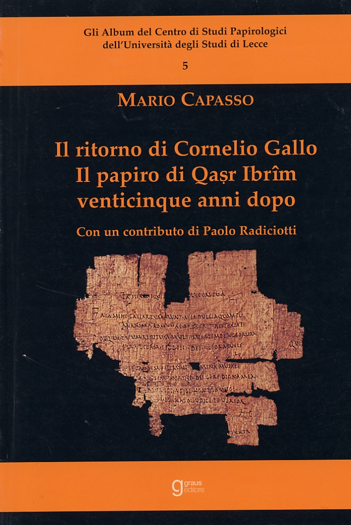 Il ritrovamento del Papiro di Qar Ibrîm più noto come Papiro di Cornelio Gallo, frammento di rotolo contenente i versi elegiaci attribuiti per l'appunto a Gaio Cornelio Gallo. Si tratta del libro latino più antico tra quelli pervenuti, che ha tanto diviso gli studiosi ma che ha fatto luce sulla figura poetica di Cornelio Gallo, trovato da una Missione Archeoogica anglo-americana patrocinata dall'Egypt Exploration Society, poi trafugato, e infine ritrovato dall'equipe dell'archeologo Mario Capasso.| Autore | Mario Capasso |