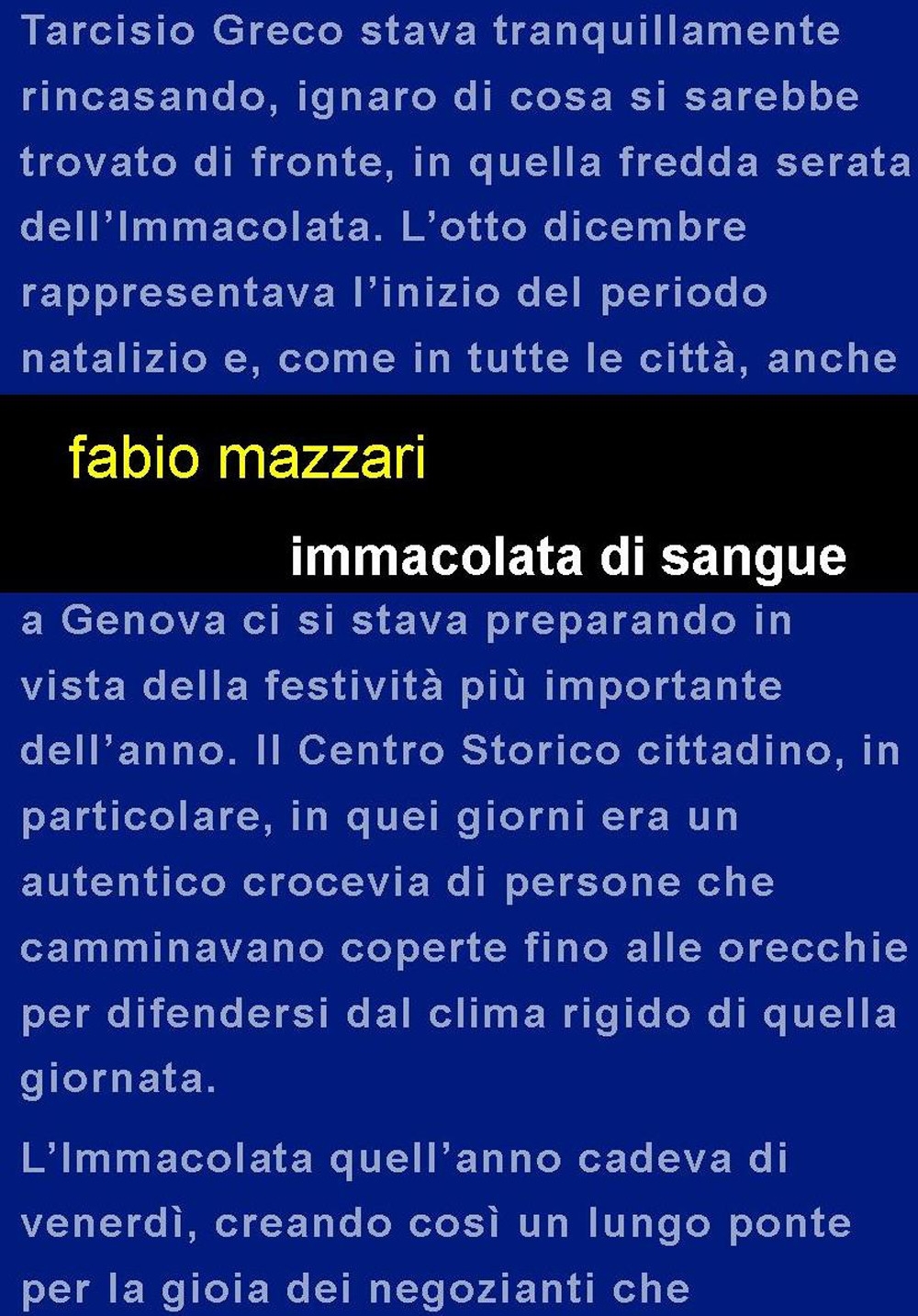 Genova 1956, il giorno dell’Immacolata. Un noto imprenditore, Tarcisio Greco, rinviene in un lago di sangue il corpo della moglie Elena nel salotto di casa. Un omicidio senza movente e senza spiegazione. Chi aveva ragione di uccidere la brava e rispettabile Elena? Il burbero Commissario Poggi inizierà un’indagine nei segreti di una famiglia modello. Cosa si cela dietro a quel quadro di famiglia perfetta?| Autore | Fabio Mazzari |