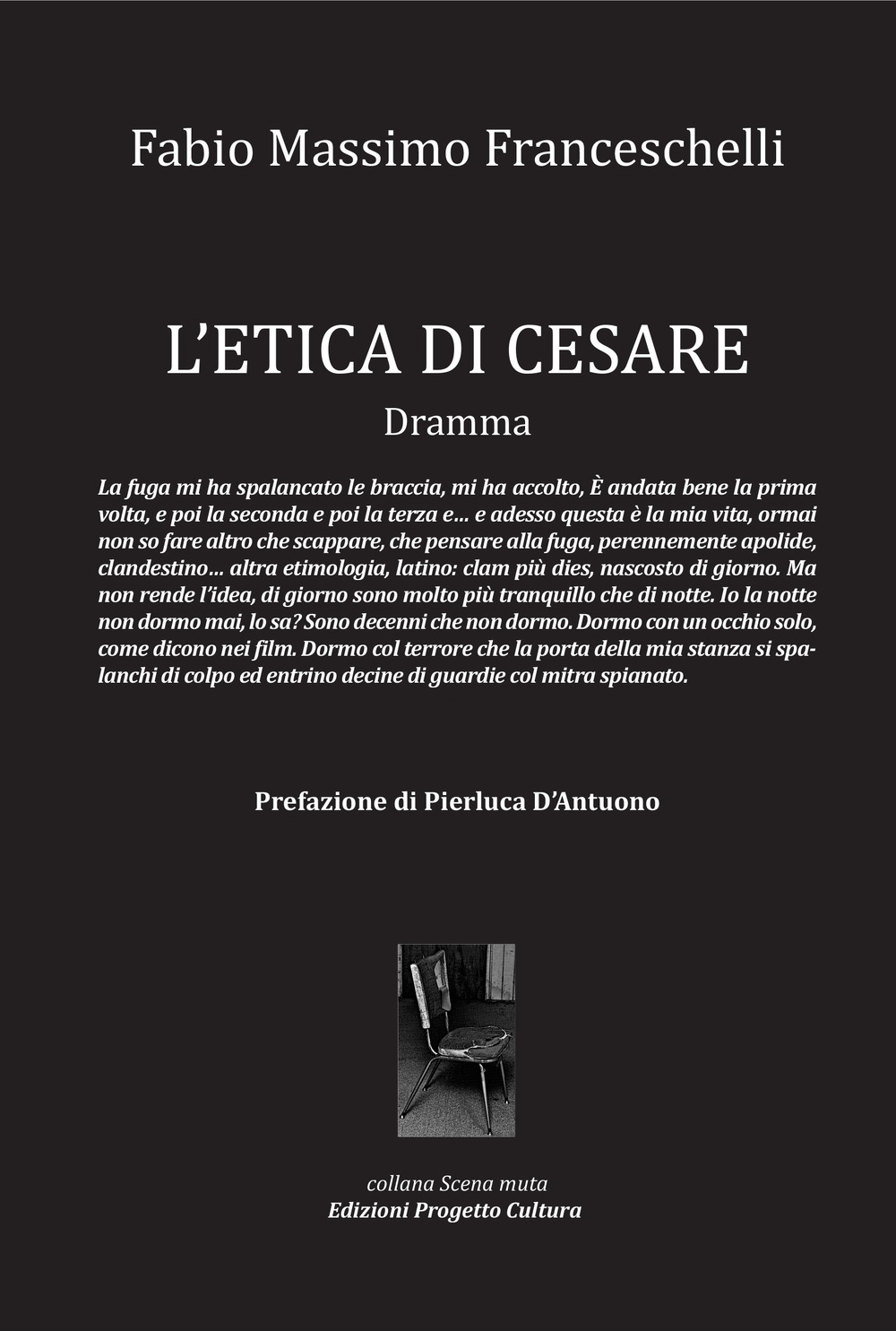 La fuga mi ha spalancato le braccia, mi ha accolto, È andata bene la primavolta, e poi la seconda e poi la terza e… e adesso questa è la mia vita, ormainon so fare altro che scappare, che pensare alla fuga, perennemente apolide,clandestino… altra etimologia, latino: clam più dies, nascosto di giorno. Manon rende l’idea, di giorno sono molto più tranquillo che di notte. Io la nottenon dormo mai, lo sa? Sono decenni che non dormo. Dormo con un occhio solo,come dicono nei film. Dormo col terrore che la porta della mia stanza si spalanchidi colpo ed entrino decine di guardie col mitra spianato.| Autore | Fabio Massimo Franceschelli |