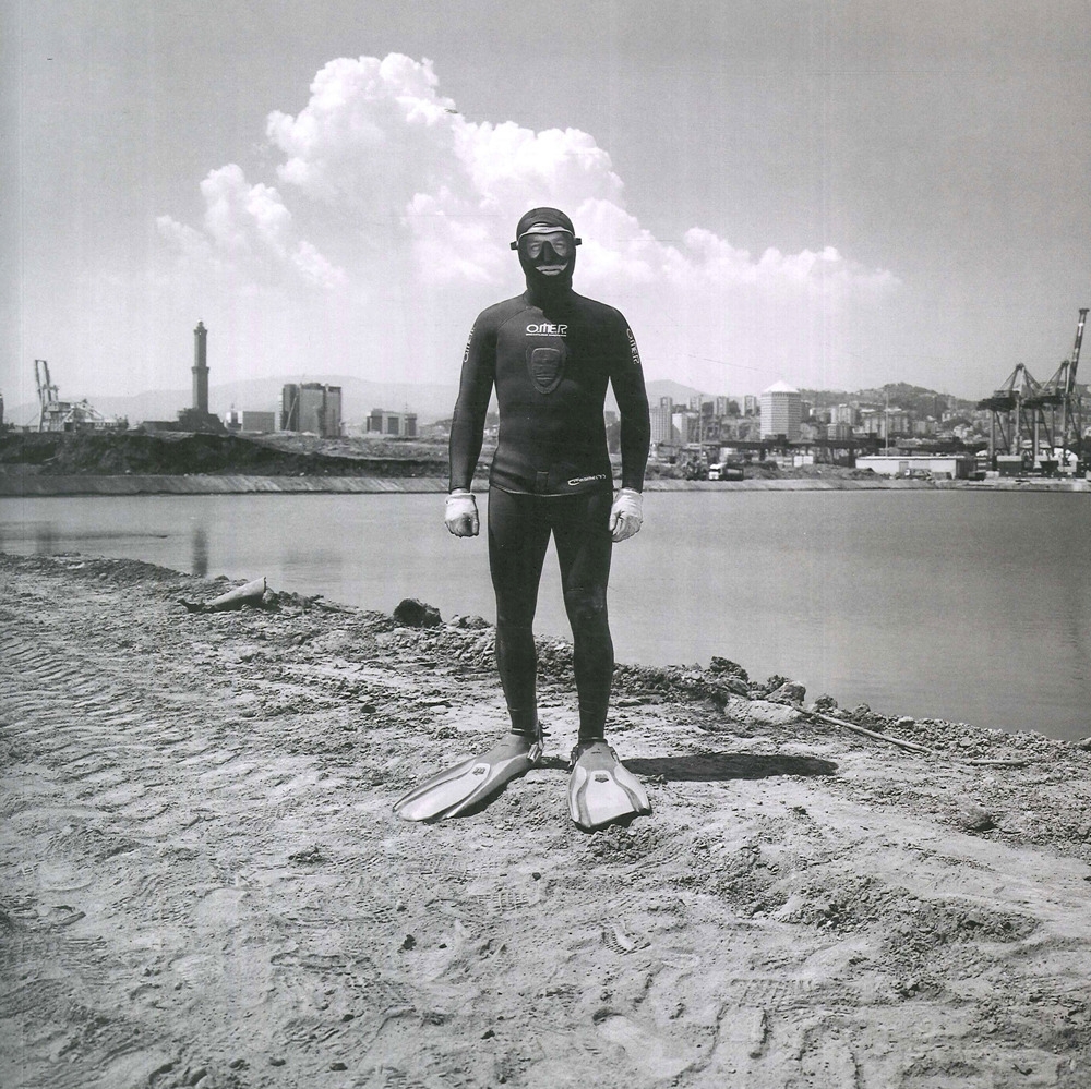 "In casi come questo corri il rischio di essere vinto dal folclore della bellezza dei porti, soprattutto i porti come Genova che hanno un rapporto visivo con la parte storica della città. La mia metodologia è sempre la stessa: mi concentro sulla lettura degli indizi, sia quelli visivi che quelli intercettati durante lo studio della letteratura sul territorio. Ho pensato così di creare quattro cataloghi di immagini, quattro capitoli che corrispondono ad altrettante storie: i ritratti di chi lavora all’interno di questo immenso cantiere; un capitolo di fotografie topografiche che documenta la trasformazione del territorio; un lavoro di 'still-life' che repertizza in modo scientifico alcuni oggetti emersi dai fondali; e infine una sequenza in bianco e nero che guarda alle nuove terre emerse come si trattasse di una fotografia lunare, marziana, evocando il linguaggio delle prime fotografie di un pianeta alieno. In questo quarto capitolo, che ho chiamato 'Man on the Moon', per la prima volta mi sono trovato a fotografare in bianco e nero, non perché volessi dare una visione nostalgica ed evocativa delle terre emerse ma perché è così che mi sono sentito: come Armstrong e Aldrin..." (L'autore)| Autore | Francesco Jodice |