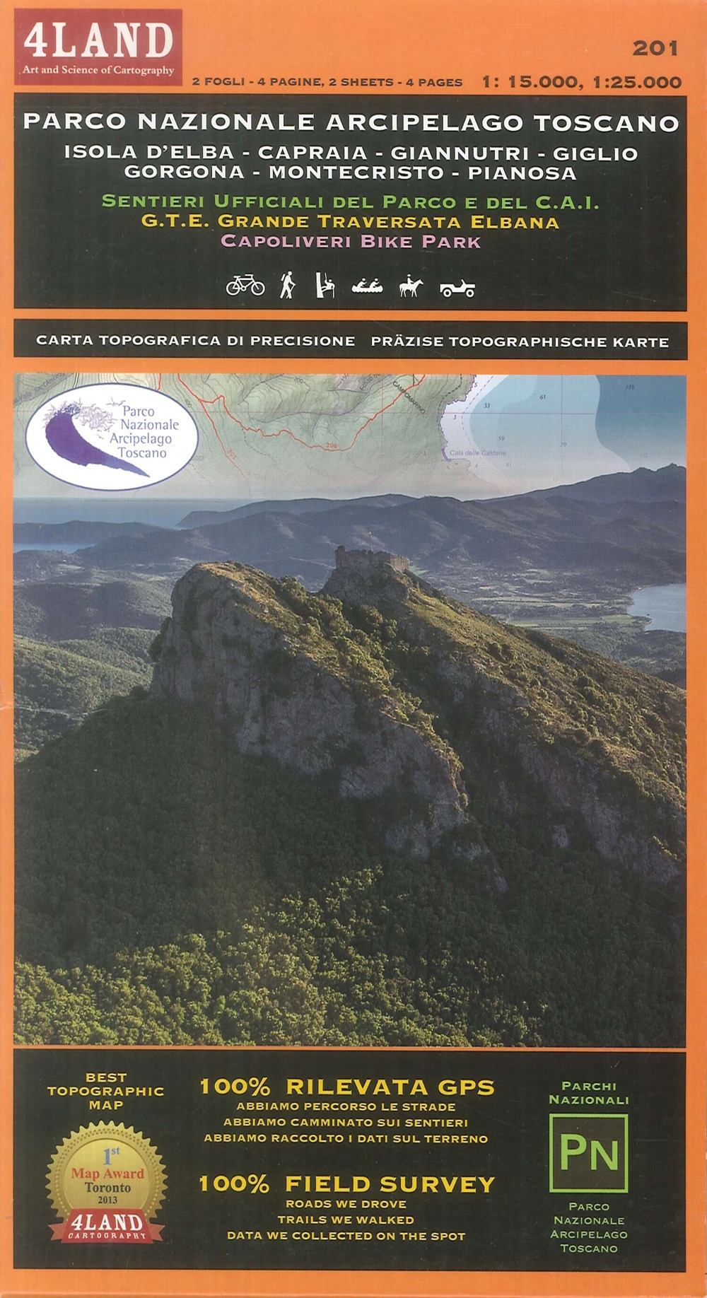 Cartografia ufficiale del Parco Nazionale Arcipelago Toscano realizzata in collaborazione con il Parco e con il CAI. Tutti i sentieri ufficiali del Parco, del CAI, tutti i punti d’interesse, le aree protette a terra e a mare, le informazioni culturali e logistiche e le spiagge. È adatta per chi pratica escursionismo, mountain bike, e passeggiate a cavallo. Cofanetto di due carte, una con l’Isola d’Elba a scala 1:25.000, l’altra con le singole isole a scala 1:15.000. Stampata su Polyart, materiale impermeabile, anti-strappo e riciclabile.| Autore | Enrico Casolari |