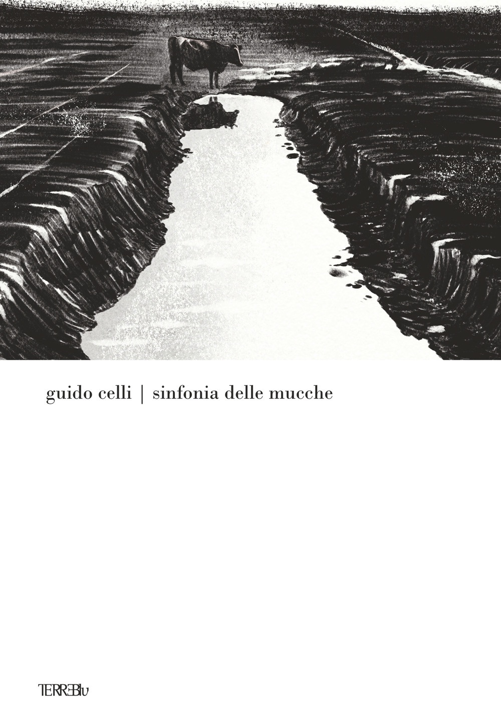 Protagonisti sono gli elementi primari della cosmogonia agreste: le mandrie, le argille, i fossi, le erberie, i pantani e la volta celeste. Tutti letti, definiti, simbolizzati e pentagrammati mediante la lente drammatica del Mito, con l’energia dell’assoluto che ha per pantheon il Mondo e i suoi mattinali. Nel tentativo/tensione di disegnare una mistica e materica metopa nei cui bassorilievi si va tracciando il profilo d’osso, l’abside e la figura forma della crosta terrestre. Mantenendo le sfumature e il mosaico polifonico di più prospettive, lo sguardo è principalmente rivolto al nodo muscolare che è in noce alla cartilagine della mandria, interpretato come il punto di sutura fra il cielo e la terra, come unico ponte e via di transito fra il visibile e l’invisibile. Nella convinzione che solo gli occhi delle mucche comprendano cosa l’addome del pianeta Terra effettivamente sia.| Autore | Guido Celli |