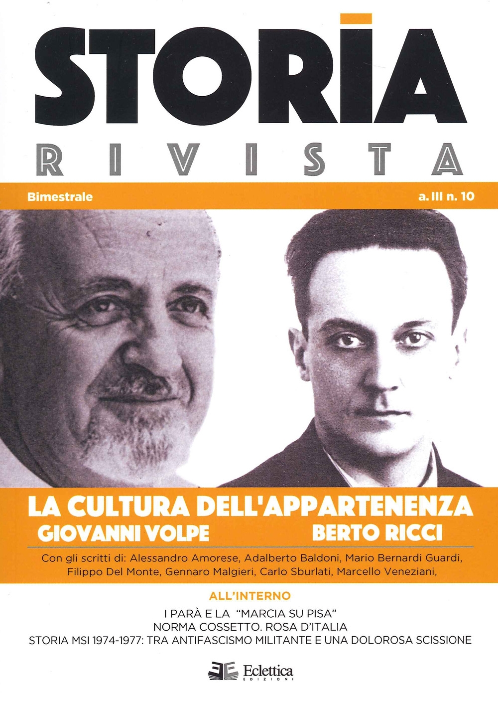 Il N.10 di Storia Rivista con uno speciale dedicato a Giovanni Volpe, l'editore ingegnere, ed a Berto Ricci. E poi la decima puntata della storia del Msi, un episodio inedito del fascismo torinese e perugino, approfondimenti su Norma Cossetto, sugli anni di piombo, ecc.| Editore | Eclettica |