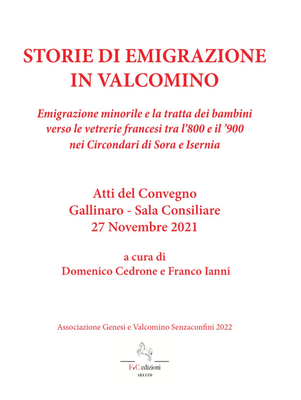 A cura delle Associazioni "Genesi" e "Valcomino senzaconfini" una interessante pubblicazione con gli atti del convegno di Gallinaro del 26 novembre 2021, riguardante la tratta dei fanciulli della Valcomino, comprati per 100 lire e portati a lavorare nelle vetrerie francesi, dove perivano nel giro di pochi anni.| Editore | F & C Edizioni |