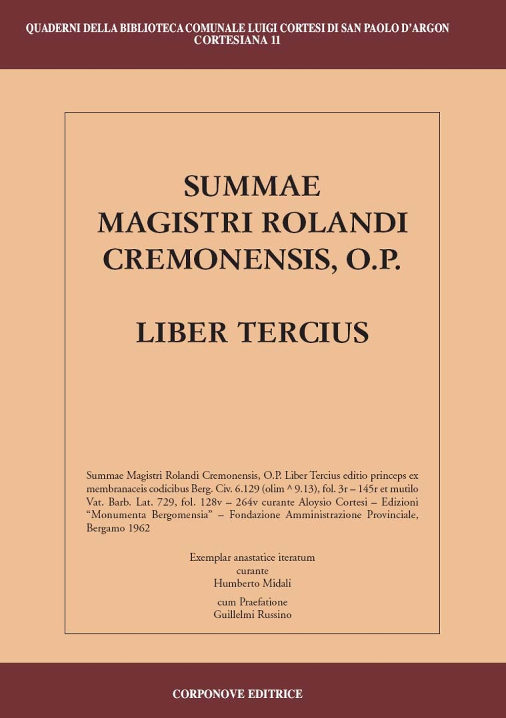 Maestro celebre, con cattedra a Bologna, Rolando, nel 1229, riceve la prima cattedra di teologia assegnata a Parigi a un frate domenicano. Tornato in Italia, dal 1233 ricopre incarichi inquisitoriali. Nel 1244 Innocenzo IV gli chiede di istituire il processo per eresia contro Ezzelino da Romano. Insieme al determinato impegno antiereticale, Rolando lavora alla "Summa" (di cui fa parte il presente "Liber tercius"), la quale rimase quasi subito nel cono d'ombra di Alberto Magno e Tommaso d'Aquino. Nella Summa, si delinea la struttura fondamentale del discorso tomista sull'eresia, insieme ad altri interessanti temi. "La varietà delle questioni trattate, insieme con la vivacità degli esempi e delle osservazioni personali - scrive il prof. Guglielmo Russino - fanno della Summa un testo prezioso per una più piena comprensione della grande stagione della scolastica duecentesca. La ristampa del "Liber tercius", frutto del lavoro di monsignor Cortesi, aggiunge un tassello al programma di pubblicazione dell'intero "corpus rolandiano", portato avanti da don Midali con una pazienza e una determinazione di cui non possiamo che essergli profondamente grati".| Editore | Corponove |