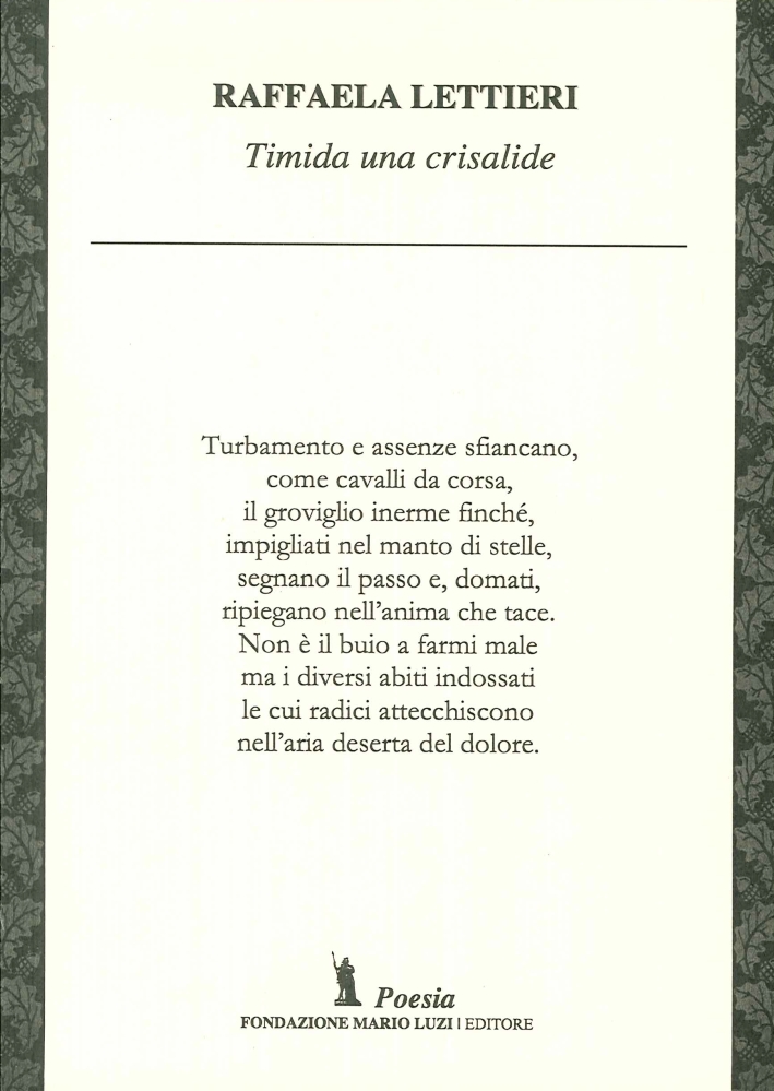 "Questi versi dell'autrice, la sua intera opera, sono una sorta di ritrascrizione del silenzio, per riprodurre un'audizione meditata, riflessa del riverbero universale del mondo, accolto in noi, fatto nostro e noi divenuti, finalmente, sua crisalide. L'opera, in fondo, se vogliamo ben vedere, è il racconto in versi di una nascita e, perciò archetipo di vita, l'apprestarsi ad una nuova esistenza, l'attivazione, attraverso il tocco salvifico dell'universo, ad una accresciuta percezione, ad una vera e propria altra forma e modo d'essere. È, accadimento, profezia, avvento, epifania dei cuori, in sintonia con un respiro universale che entra fervido e sconvolgente nelle nostre vite, per cambiarle per sempre, renderle immortali nello spirito di solidale appartenenza alla grande ed indivisa maternità del mondo." (Dalla prefazione di Mattia Leombruno, Presidente della Fondazione Mario Luzi marioluzi.it)| Autore | Raffaela Lettieri |