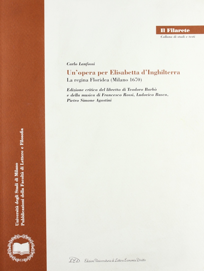 Il mito letterario delle vicende amorose della regina Elisabetta I e del Conte di Essex rivive nel dramma per musica. La regina Floridea, uno tra i pochi esempi superstiti di partiture del teatro d'opera milanese seicentesco. La prima trasposizione drammatica degli intrighi reali inglesi si deve a Coello, il cui Conde de Sex fu oggetto di rielaborazione in area italiana grazie a tre canovacci della Commedia dell'Arte e al dramma La regina statista di N. Biancolelli. Questo sostrato letterario è alla base del libretto della Regina Floridea, il cui autore, finora ignoto, è qui identificato in T. Barbò, mentre gli autori delle musiche sono F. Rossi, L. Busca e P.S. Agostini. L'individuazione di almeno sette riprese in diversi teatri italiani testimonia una duratura fortuna del dramma e pone le basi per una riconsiderazione del pregiudizio storiografico che vede nella Milano spagnola un centro operistico dipendente da Venezia. L'edizione critica del libretto e della partitura è preceduta da un'ampia sezione storico-introduttiva sulla tradizione del soggetto e sulla sua rielaborazione in forma di libretto; fa seguito un'indagine su tutti gli allestimenti rintracciati fra il 1670 e il 1722.| Autore | Carlo Lanfossi |