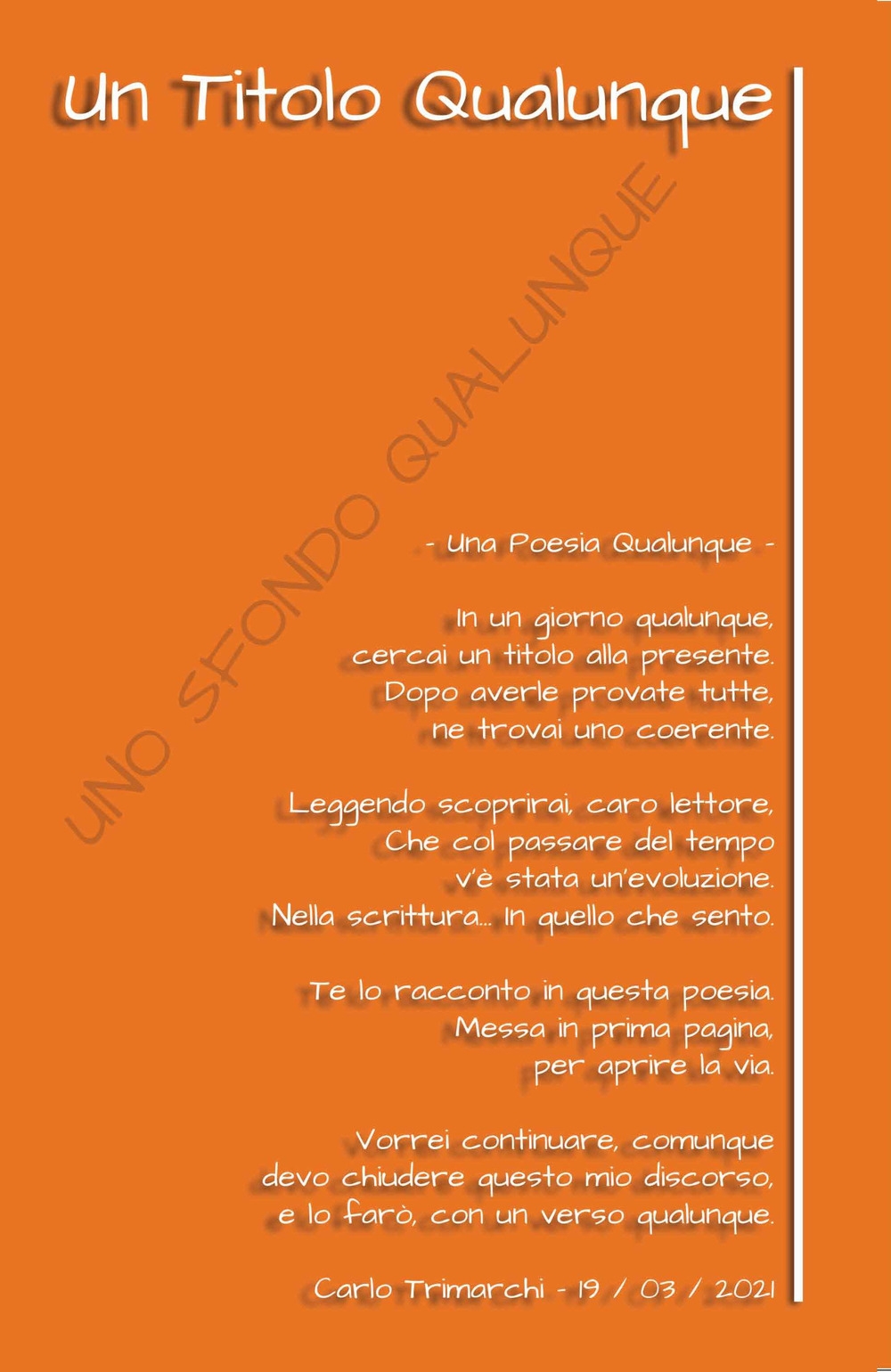 Carlo Trimarchi racchiude in questa raccolta una parte sostanziale della sua produzione, varia per stili e per temi, la quale rappresenta una incessante ricerca verso una propria voce e una propria poetica, affrontando temi più o meno consueti, sentimenti, passioni, in pratica la dialettica dell'esistenza. Un titolo qualunque, dunque, da dare a poesie che non sono qualunquistiche, ma che cercano in ogni singola parola un modo di leggere se stessi e il mondo.| Autore | Carlo Trimarchi |
