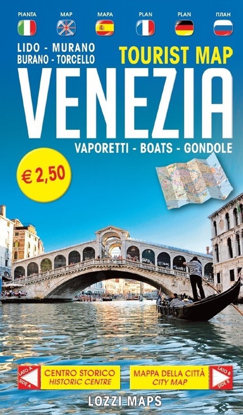 Mappa e guida in carta della città di Venezia con i percorsi delle linee di navigazione, i parcheggi auto, le gondole e i principali percorsi pedonali. Sul retro l'elenco stradale e il centro storico della città le foto dei monumenti, l'indicazione delle coordinate e la descrizione in sei lingue.| Editore | Lozzi Publishing |
